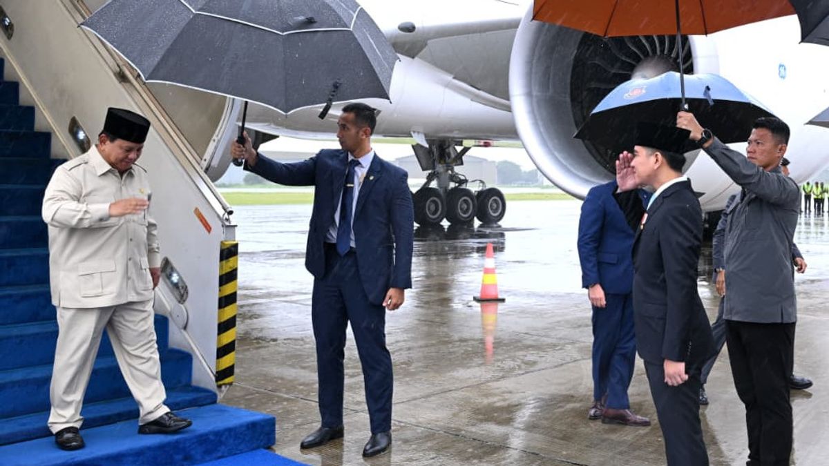 Pesawat kepresidenan Garuda Indonesia-1 mendarat di Pangkalan TNI AU Halim Perdanakusuma, Jakarta, saat hujan mengguyur sejak pagi. Setibanya di bawah tangga pesawat, Prabowo menyapa para pejabat yang menjemput.